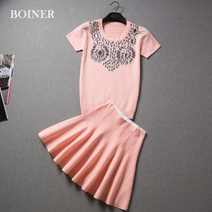 歐洲站2015春夏新品女裝休閑針織鑲鉆百褶短裙兩件套女式套裝批發 /