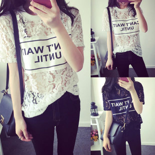 韓版時尚 性感鏤空透視蕾絲字母印花蕾絲上衣 /