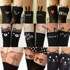 日系春季女士假高筒卡通印花紋身拼接絲襪 長筒過膝打底連褲襪 /