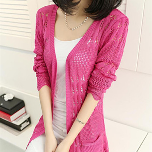 2015夏季新款韓版寬松薄款中長款顯瘦鏤空針織衫女開衫外套 /