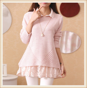 2015早春新款兔絨翻領兩件套韓版蕾絲下擺針織衫打底修身連衣裙 /