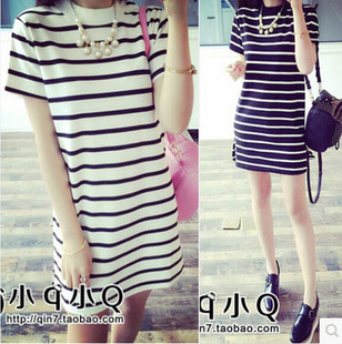 • 春裝新款 氣質(zhì)韓國(guó)風(fēng) 橫條紋側(cè)開叉短袖長(zhǎng)款T恤連衣裙 /