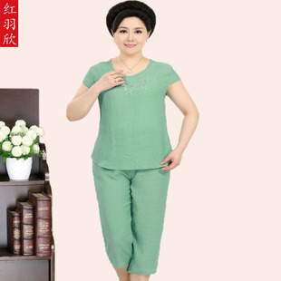 批發(fā)中年婦女夏裝套裝中老年女士棉麻短袖T恤衫兩件套媽媽裝休閑 /