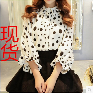 2015新款夏裝女裝黑白波點雪紡衫七分袖中長款白搭女式襯衫 /