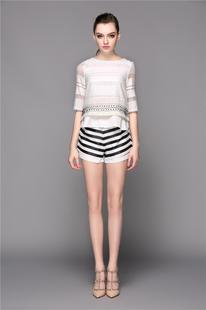 歐美春夏兩件套女裝時尚條紋釘珠中袖上衣+短褲休閑套裝 /