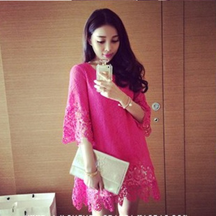 春裝新款女裝韓版寬松大碼鏤空中袖蕾絲連衣裙氣質打底A字裙 /