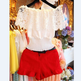 夏季新款歐洲站一字露肩蕾絲鉤花荷葉邊收腰上衣波浪短褲兩件套裝 /
