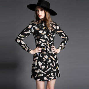 • 2015春季新款歐美高貴氣質(zhì)印花A字傘裙圓領(lǐng)收腰修身連衣裙送腰帶 /