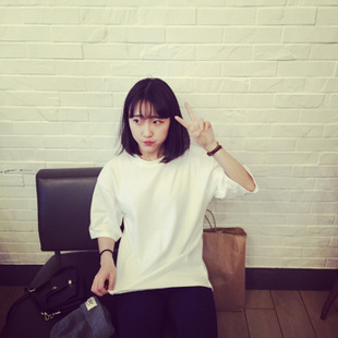 2015春復古百搭簡單寬松側開叉短袖T恤純色打底T恤女 /