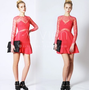 2014春季正版新款 西瓜紅圓點提花 蕾絲拼接連衣裙 一件代發 爆款 /