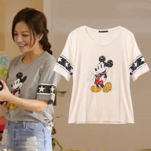 2015夏季虎媽貓爸趙薇明星同款 韓版百搭撞色米奇印花打底T恤女 /