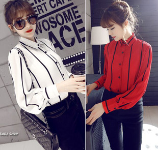 2015春季新品 韓版 顯瘦百搭豎條紋雪紡襯衫女廠家直銷 一件代發(fā) /