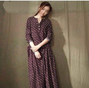 批發 2015春夏裝長袖V領森女碎花棉麻連衣裙長裙收腰時尚裙女裝 /