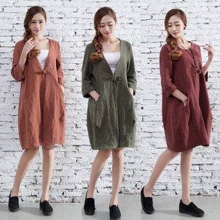 2015文藝女亞麻外套 春裝女中長款七分袖復古盤扣中長外套 /
