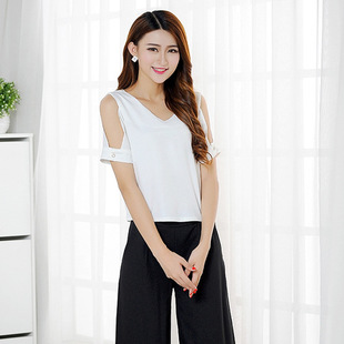 2015新款闊腿褲兩件套裝女裝襯衫春夏裝韓版氣質露肩短袖女潮品 /