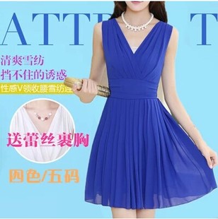 夏季新款大碼韓版修身氣質禮服無袖A字性感V領雪紡連衣裙 /