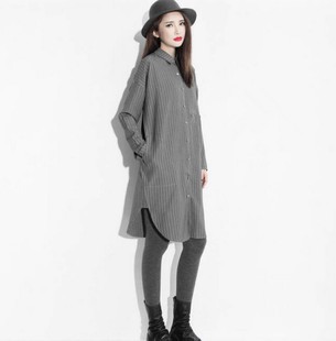 2015春款獨家定制 爽滑垂墜 BF風帥氣寬松豎條紋開叉襯衫裙 /