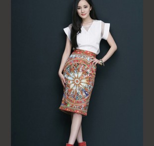 2015楊冪同款氣質顯瘦V領襯衫+復古印花包臀半裙兩件裙套裝 /