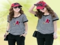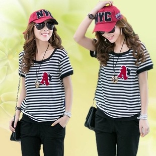 加肥加大碼女裝夏裝韓版休閑運動套裝胖mm圓領短袖七分褲條紋套裝 /