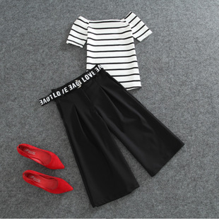 歐洲站2015夏季新款一字領彈力棉條紋上衣+高腰闊腿褲套裝配腰帶 /