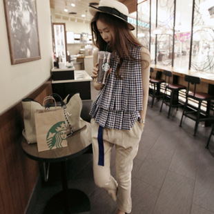 2015春夏女裝森女系棉麻格子百褶上衣搭哈倫褲套裝小香風兩件套 /