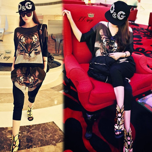 歐洲站2015春夏套裝新款女裝時尚老虎印花上衣+哈倫褲兩件套套裝 /