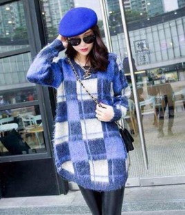 2015明星走秀款格子套頭圓領羊絨衫針織中長款修身打底衫毛衣女 /