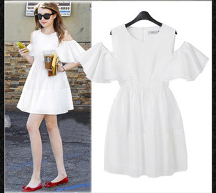 2015歐洲站新款時(shí)尚荷葉邊露肩修身顯瘦蓬蓬連衣裙 女 /