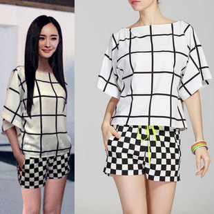 2015新款歐洲站明星同款時(shí)尚經(jīng)典格紋寬松蝙蝠袖上衣+短褲套裝 /