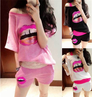 2015新款時(shí)尚潮流亮片紅唇寬松圓領(lǐng)蝙蝠袖T恤短褲休閑套裝女 /