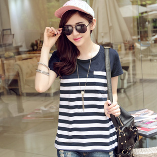 • 女式圓領(lǐng)打底衫短袖小清新條紋t恤全棉2015夏裝新品上衣一件代發(fā) /
