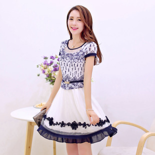2015夏季新款韓版蕾絲連衣裙 時(shí)尚氣質(zhì)修身女裝圓領(lǐng)短袖連衣裙 /