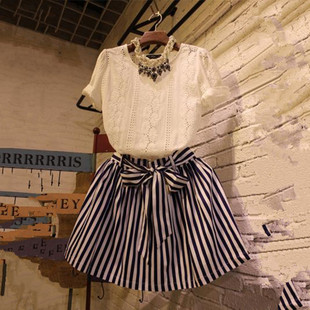 2015韓國東大門代購春夏新款 全棉鏤空短袖衫條紋修身短裙套裝女 /