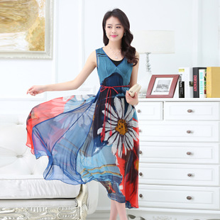 2015高檔女裝新款品牌真絲連衣裙 夏季連衣裙長裙圓領中長裙短袖 /