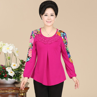 中老年女裝T恤 秋裝新款長袖T恤韓版修身圓領(lǐng)蕾絲花邊印花媽媽裝 /