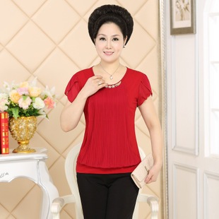 2015年中老年女裝T恤大碼媽媽裝褶皺夏裝短袖中年雪紡 /