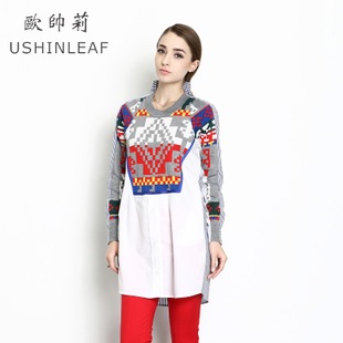 2015歐美風襯衫歐洲站女式長袖長款名族風拼接圓領上衣襯衣 /