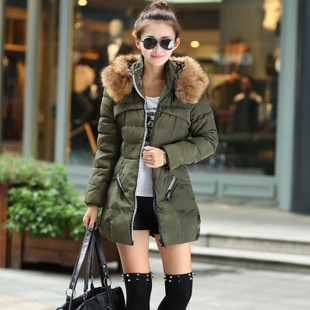 批發2015冬裝時尚韓版修身毛領連帽拉鏈中長款保暖棉衣棉服女外套 /