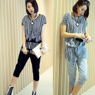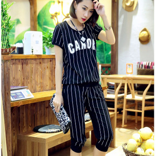 2015夏裝新款休閑套裝 運動女黑色條紋圓領(lǐng)T恤顯瘦 褲套裝 /