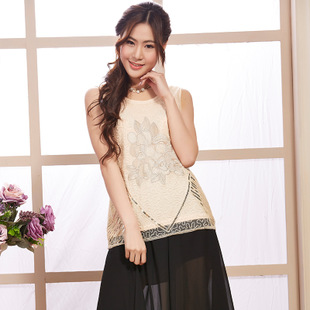 2015春夏新款蕾絲網紗立體花寬肩大碼背心打底衫女 批發 /