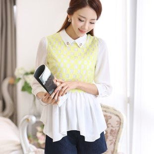 韓系2015夏裝新款韓版修身顯瘦拼接釘珠娃娃領雪紡衫中袖女裝 /