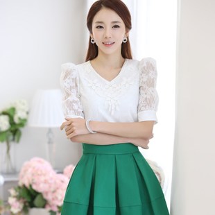韓國2015夏裝新款V領蕾絲拼接泡泡袖五分袖打底衫修身顯瘦女裝 /