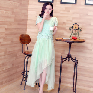 夏季蕾絲雪紡連衣長裙氣質顯瘦波西米亞不規則燕尾裙沙灘裙 /