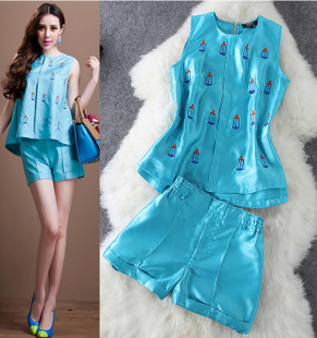 2015春季新款 歐洲站藍色休閑套裝兩件女裝新款無袖短褲繡花 /