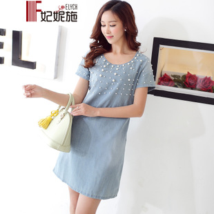 2015歐洲站新款時尚水洗牛仔釘珠甜美寬松短袖牛仔連衣裙氣質短裙 /