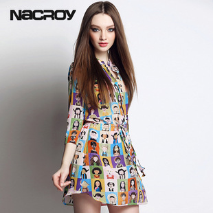 連衣裙2015女裝春夏新款歐洲站 中袖品牌代理 卡通印花氣質真絲裙 /
