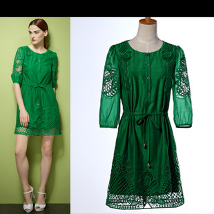 歐洲站2015春夏新款女裝歐美時尚刺繡鏤空連衣裙五分袖 /