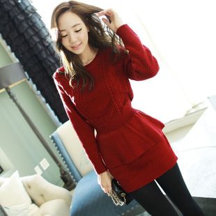 5161#2015毛衣修身包臀長袖假兩件套針織毛線連衣裙荷葉邊裙女 /