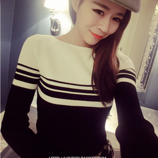8229#韓國時尚百搭撞色圓領修身款針織衫女 /