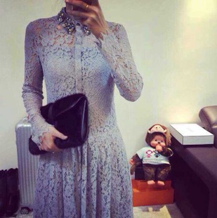2015春裝歐美釘珠寶石領子襯衫領蕾絲收腰氣質名媛大擺連衣長裙 /